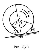 Барабан радиуса R весом P имеет выточку (как у катушки) радиуса r = 0,6R (рис. Д7.0 — Д7.9, табл. Д7). К концам намотанных на барабан нитей приложены постоянные силы F1 и F2, направления которых определяются углом β; кроме сил на барабан действует пара с моментом М; когда в таблице М<0, направление момента противоположно показанному на рисунке. При движении, начинающемся из состояния покоя, барабан катится без скольжения по шероховатой наклонной плоскости с углом наклона α так, как показано на рисунках.