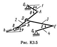 Плоский механизм состоит из стержней 1, 2, 3, 4 и ползуна В или Е (рис. КЗ.0 — К3.7) или из стержней 1, 2, 3 и ползунов В и E (рис. К3.8, К3.9), соединенных друг с другом и с неподвижными опорами O1, O2 шарнирами; точка D находится в середине стержня АВ. Длины стержней равны соответственно l1 = 0,4 м, l2 = 1,2 м, l3 = 1,4 м, l4 = 0,6 м. Положение механизма определяется углами α, β, γ, φ, θ. Значения этих углов и других заданных величин указаны в табл. КЗа (для рис. 0—4) или в табл. КЗб (для рис. 5—9); при этом в табл. КЗа ω1 и ω4 — величины постоянные.