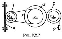 Механизм состоит из ступенчатых колес 1—3, находящихся в зацеплении или связанных ременной передачей, зубчатой рейки 4 и груза 5, привязанного к концу нити, намотанной на одно из колес (рис. К2.0 — К2.9, табл. К2). Радиусы ступеней колес равны соответственно: у колеса 1 – r1 = 2 см, R1 = 4 см, у колеса 2 – r2 = 6 см, R2 = 8 см, у колеса 3 – r3 — 12 см, R3 = 16 см. На ободьях колес расположены точки A, В и С.