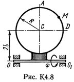 Прямоугольная пластина (рис. К4.0 — К4.4) или круглая пластина радиуса R = 60 см (рис. К4.5 — К4.9) вращается вокруг неподвижной оси по закону φ = f1(t), заданному в табл. К4. Положительное направление отсчета угла φ показано на рисунках дуговой стрелкой. На рис. 0, 1, 2, 5, 6 ось вращения перпендикулярна плоскости пластины и проходит через точку О (пластина вращается в своей плоскости); на рис. 3, 4, 7, 8, 9 ось вращения OO1 лежит в плоскости пластины (пластина вращается в пространстве)