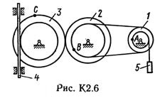 Механизм состоит из ступенчатых колес 1—3, находящихся в зацеплении или связанных ременной передачей, зубчатой рейки 4 и груза 5, привязанного к концу нити, намотанной на одно из колес (рис. К2.0 — К2.9, табл. К2). Радиусы ступеней колес равны соответственно: у колеса 1 – r1 = 2 см, R1 = 4 см, у колеса 2 – r2 = 6 см, R2 = 8 см, у колеса 3 – r3 — 12 см, R3 = 16 см. На ободьях колес расположены точки A, В и С.