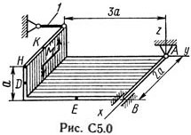 Две однородные прямоугольные тонкие плиты жестко соединены (сварены) под прямым углом друг к другу и закреплены сферическим шарниром (или подпятником) в точке А, цилиндрическим шарниром (подшипником) в точке В и невесомым стержнем 1 (рис. С5.0 — С5.7) или же двумя подшипниками в точках A и В и двумя невесомыми стержнями 1 и 2 (рис. С5.8, С5.9); все стержни прикреплены к плитам и к неподвижным опорам шарнирами.