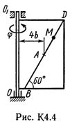 Прямоугольная пластина (рис. К4.0 — К4.4) или круглая пластина радиуса R = 60 см (рис. К4.5 — К4.9) вращается вокруг неподвижной оси по закону φ = f1(t), заданному в табл. К4. Положительное направление отсчета угла φ показано на рисунках дуговой стрелкой. На рис. 0, 1, 2, 5, 6 ось вращения перпендикулярна плоскости пластины и проходит через точку О (пластина вращается в своей плоскости); на рис. 3, 4, 7, 8, 9 ось вращения OO1 лежит в плоскости пластины (пластина вращается в пространстве)